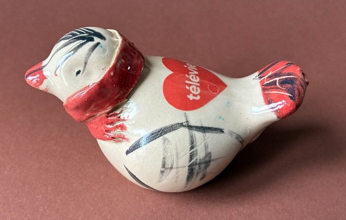 Dëse flotte Péckvillchen, mat Schal an Logo Télévie, déi mer verkafen zu Gonschten vum Télévie gouf an dem Keramikatelier vun der Fondatioun Kräizbierg entworf an och do fabrizéiert. Péckvillchen kascht s vun 40 €.